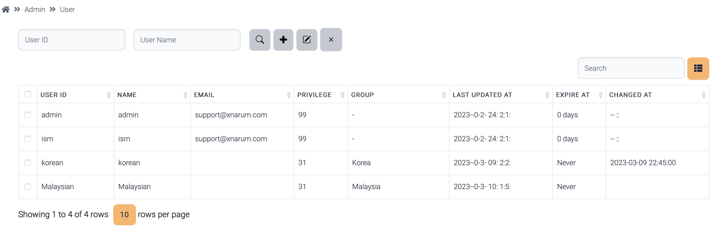 User is the user of Admin UI. A user has a privilege, and this privilege is used to control the access to the menus of Admin UI.