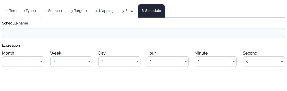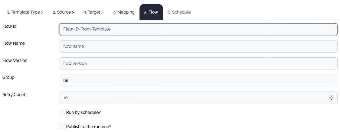 If this flow will be executed by scheduler, define the schedule. The properties provided in the template dialog are not the full set of the properties. If you need further configuration, edit the schedule later manually.
