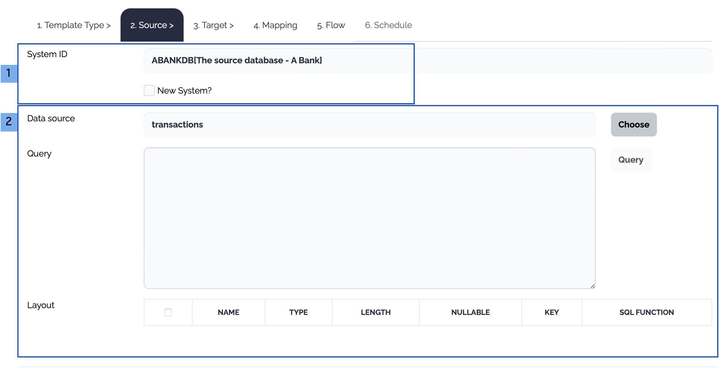 Or type a query to select data from the source database and click Query button. The columns of the query are displayed as a data structure.