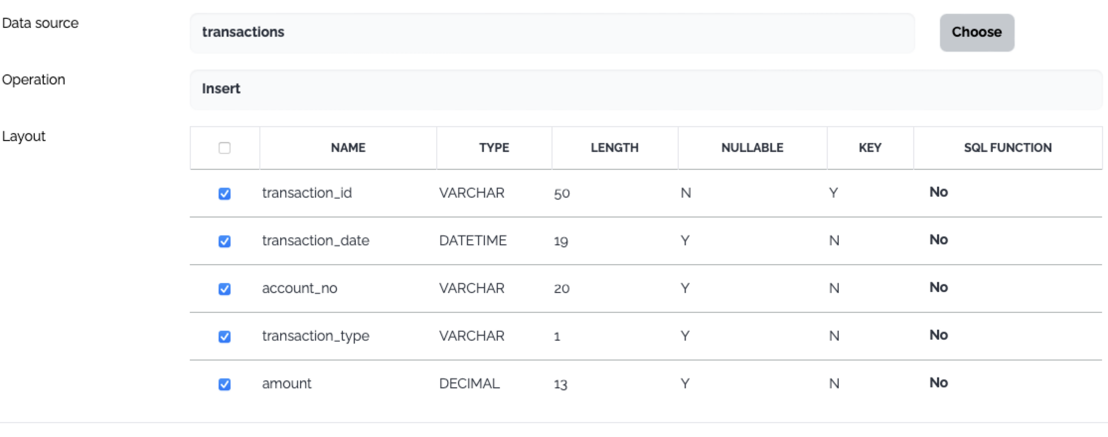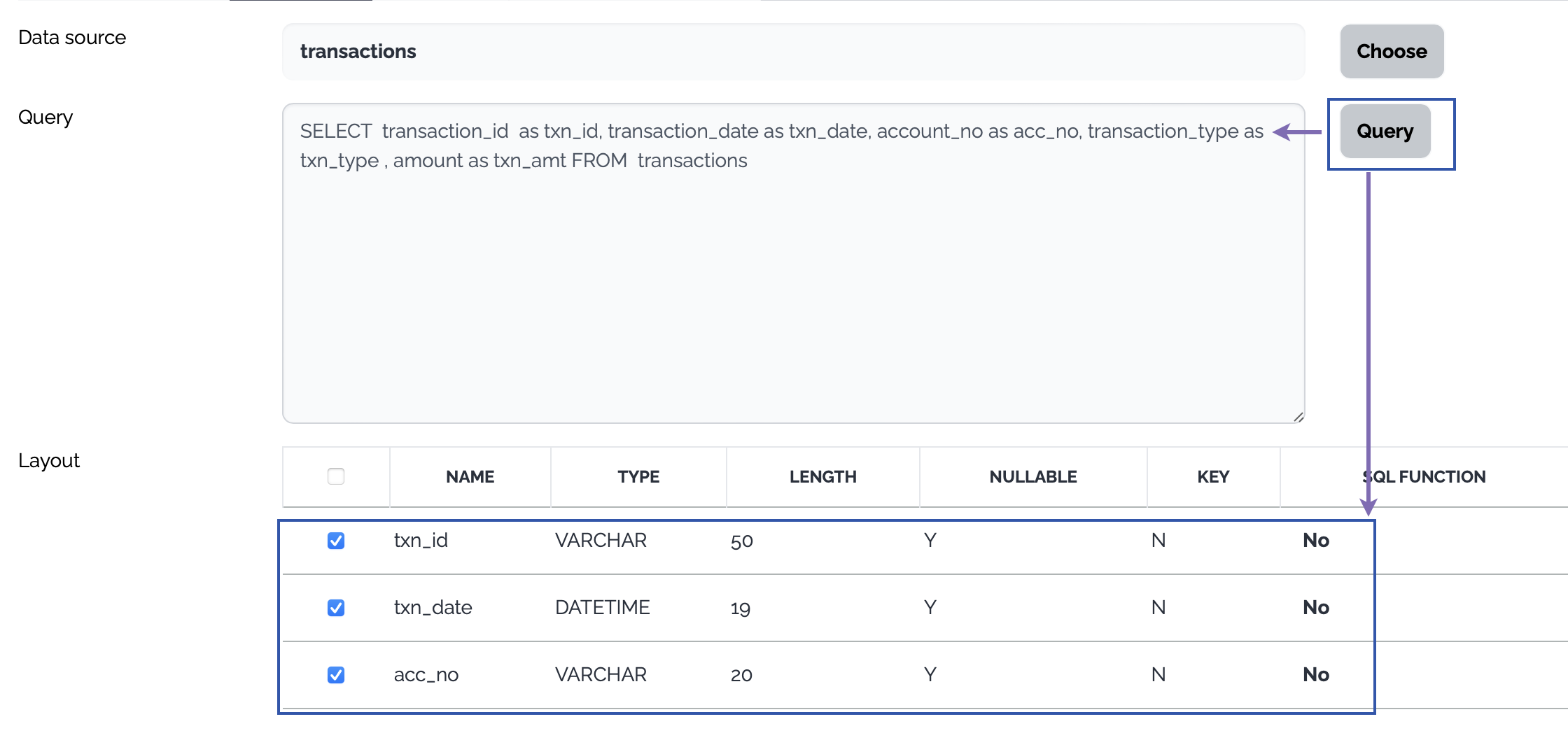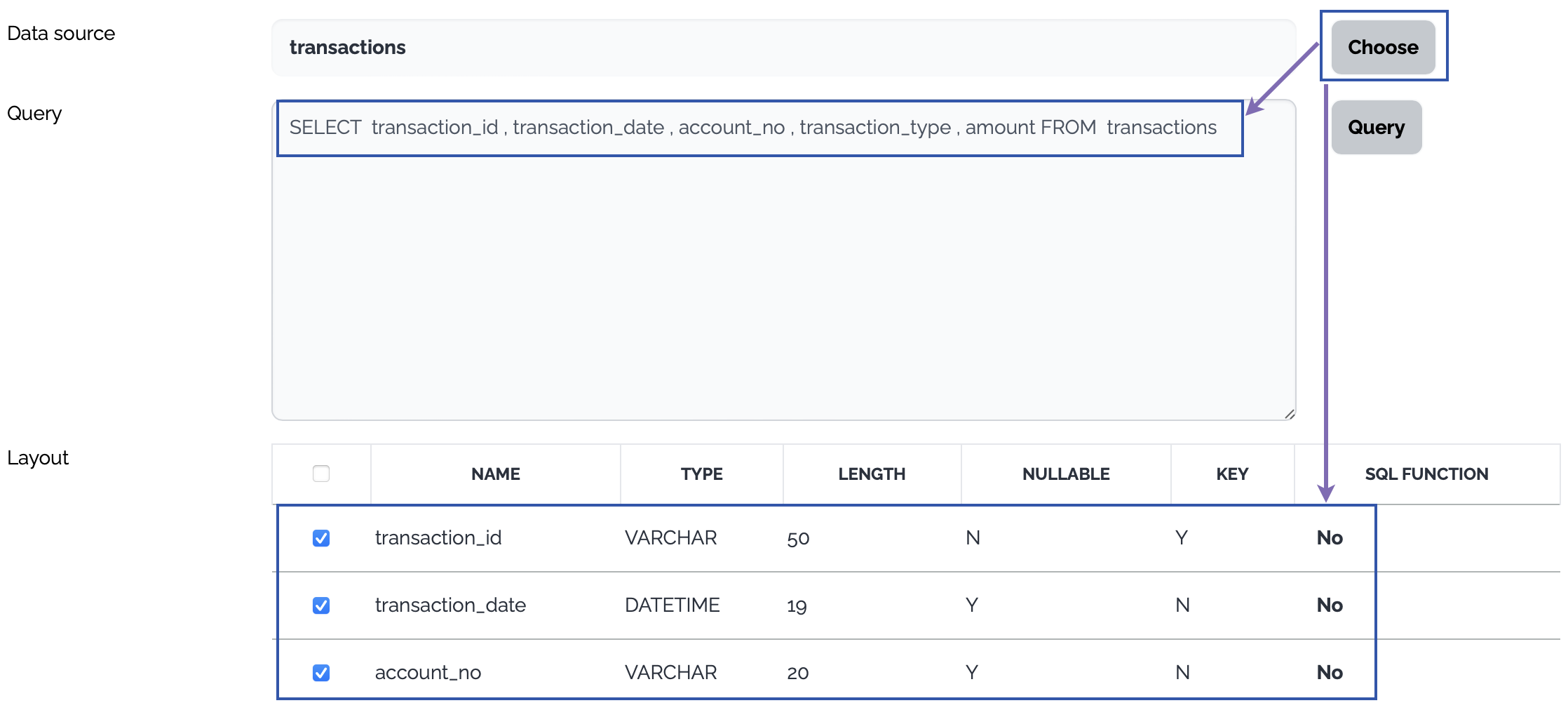 Click Choose button, a select query is generated from the layout of the selected table and the columns of the select query are displayed as a data structure.