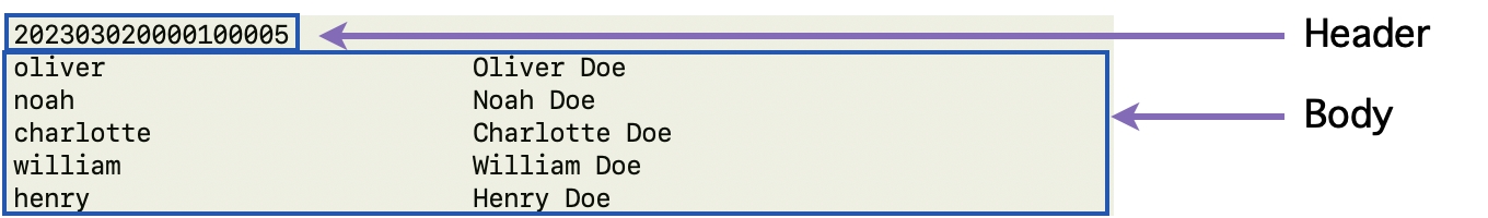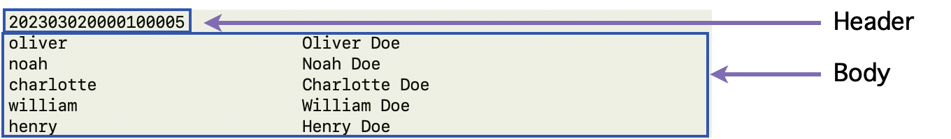The header has 3 fields and body has 2 fields and repeatable. The repeat count, i.e., the record count is determined by the 3rd field of the header. The 3rd field of the header indicates repeat count is 5, and body part is repeated 5 times. If the repeat count is fixed, then no indicator is used.