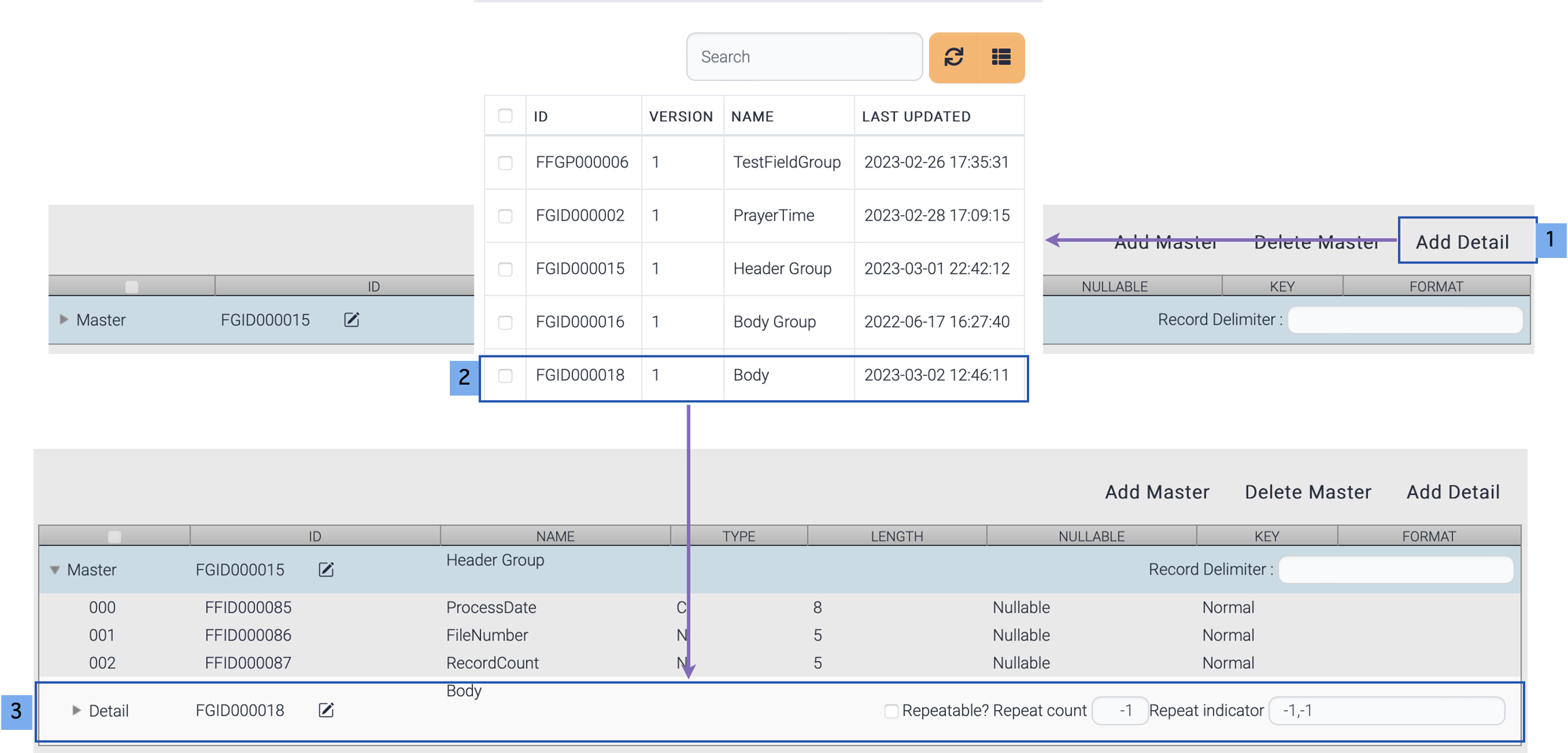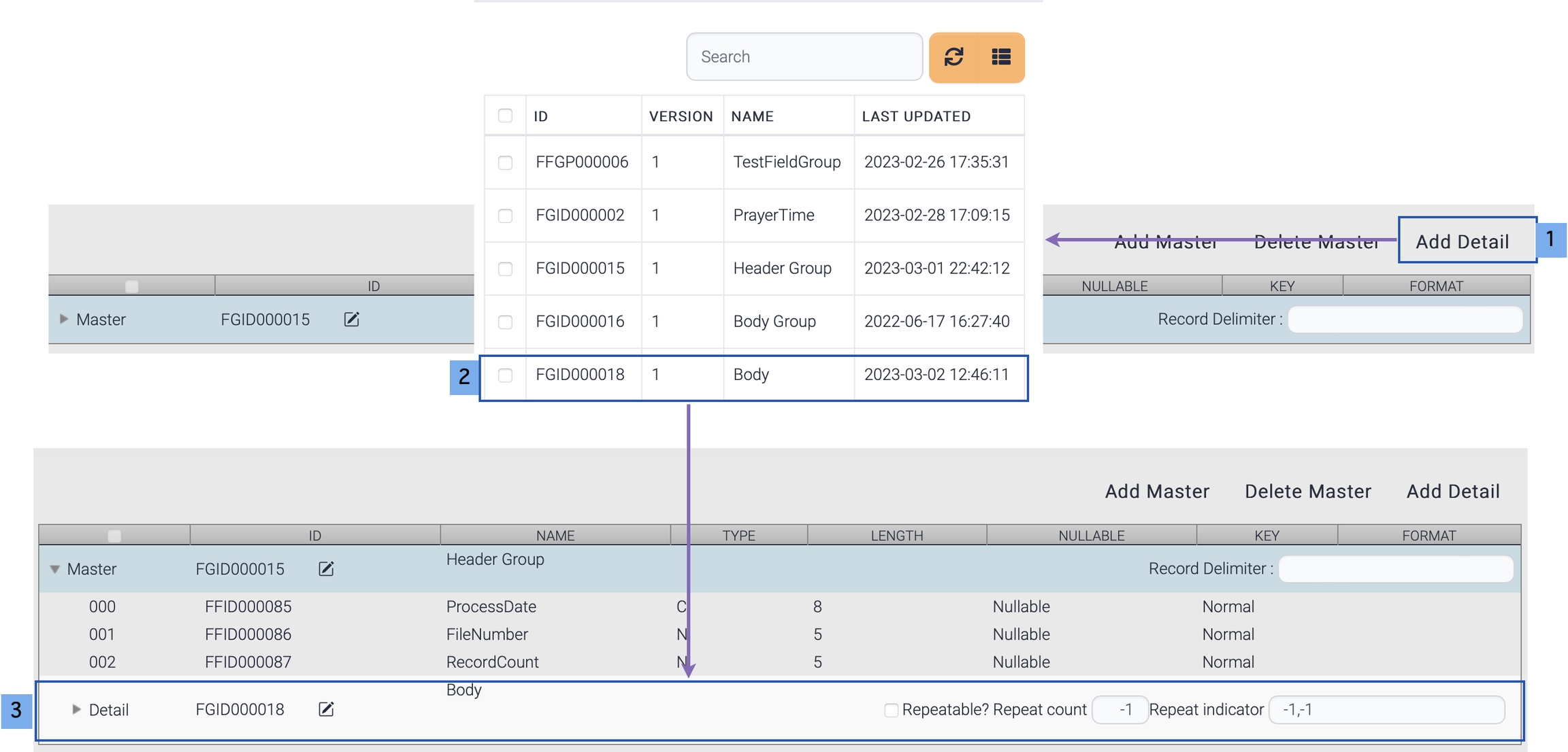 Master and detail are field groups. One master field group can have multiple (0..N) detail field groups.