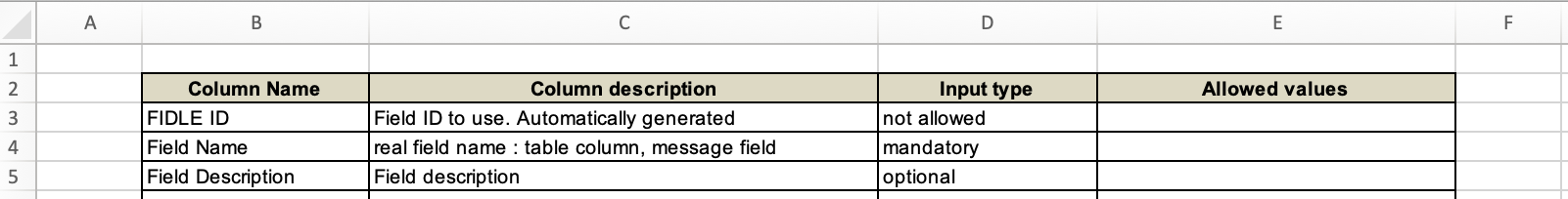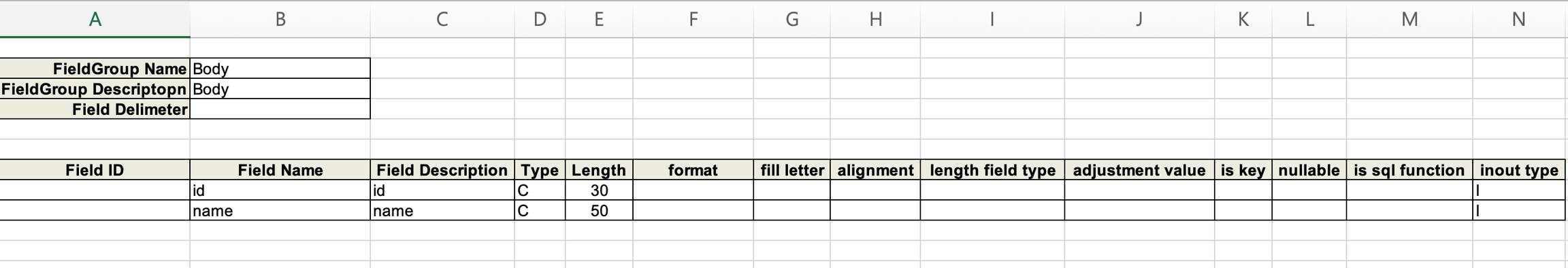 Template excel sheet looks like this screenshot. The sample template file(fieldgroup_meta.xls) is located under data directory.