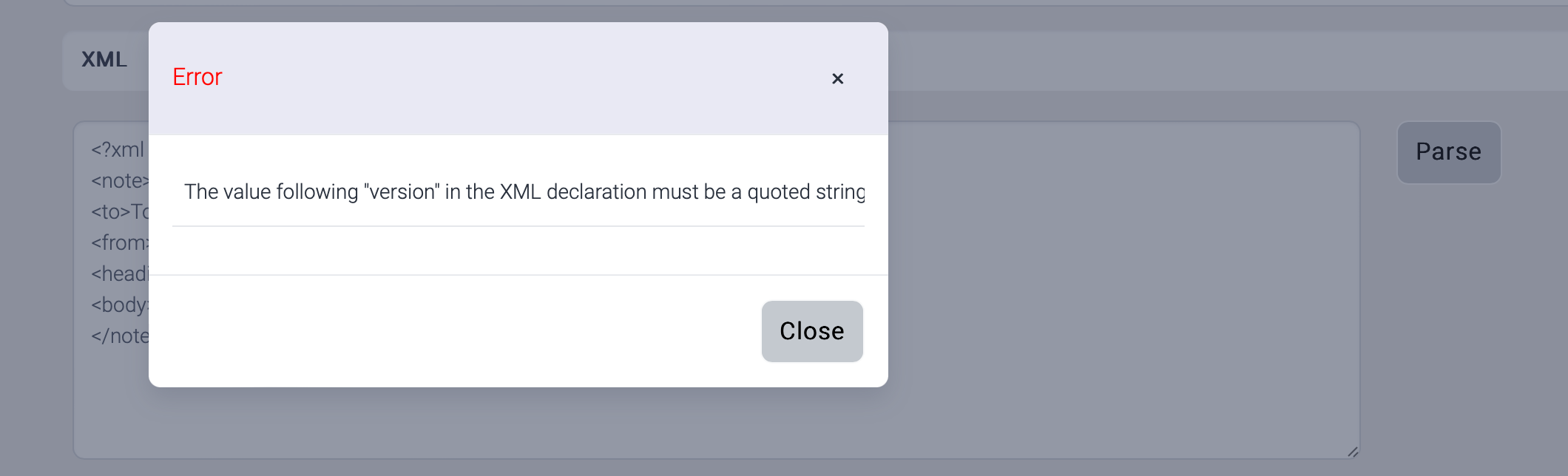 If the sample xml is copied from an editor like Microsoft Word, xml parsing may fail. The single quotation('') and double quotation("") are not same as the text editor.
