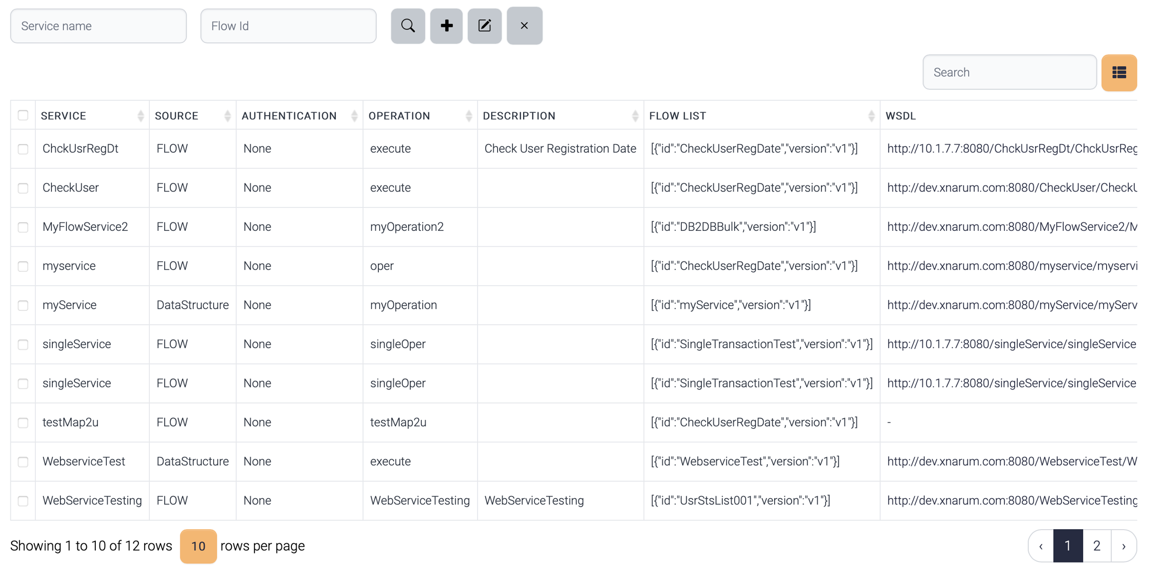 Web services can be generated from flow, data structure, or WSDL. Generated web services are deployed to the specific instances automatically.