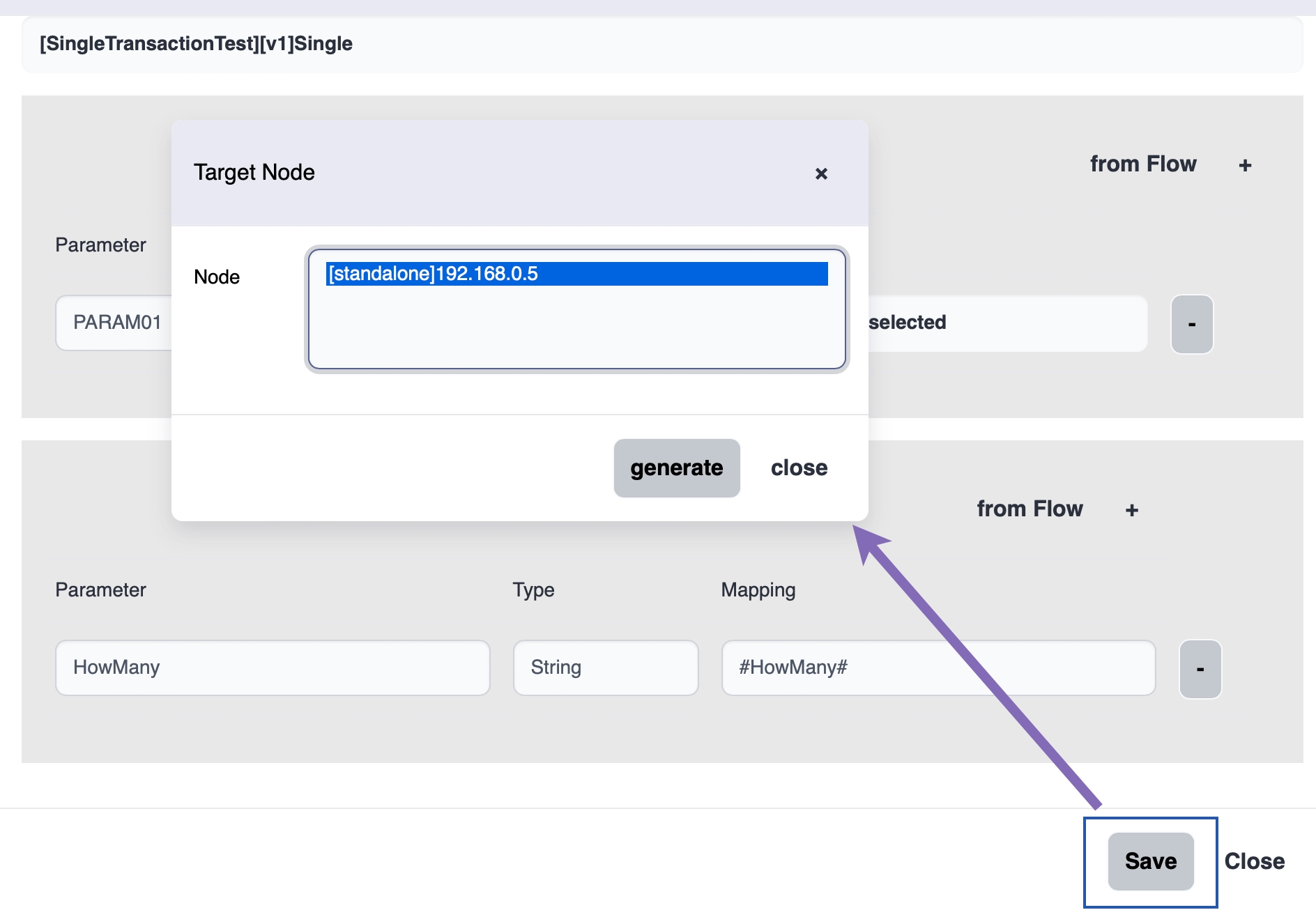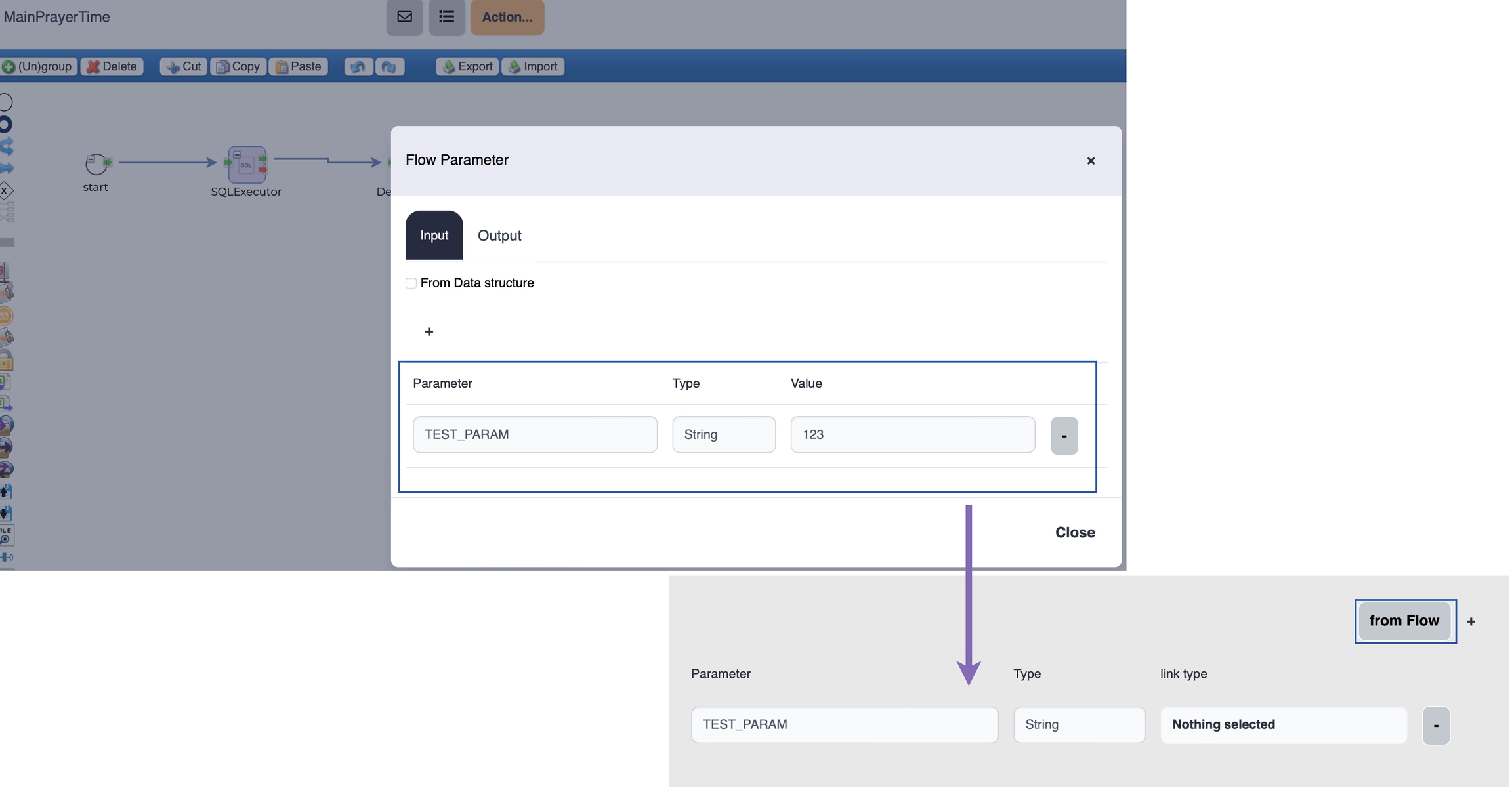 Output parameters are response data to the client and can be generated from the output parameters of the target flow or manually.