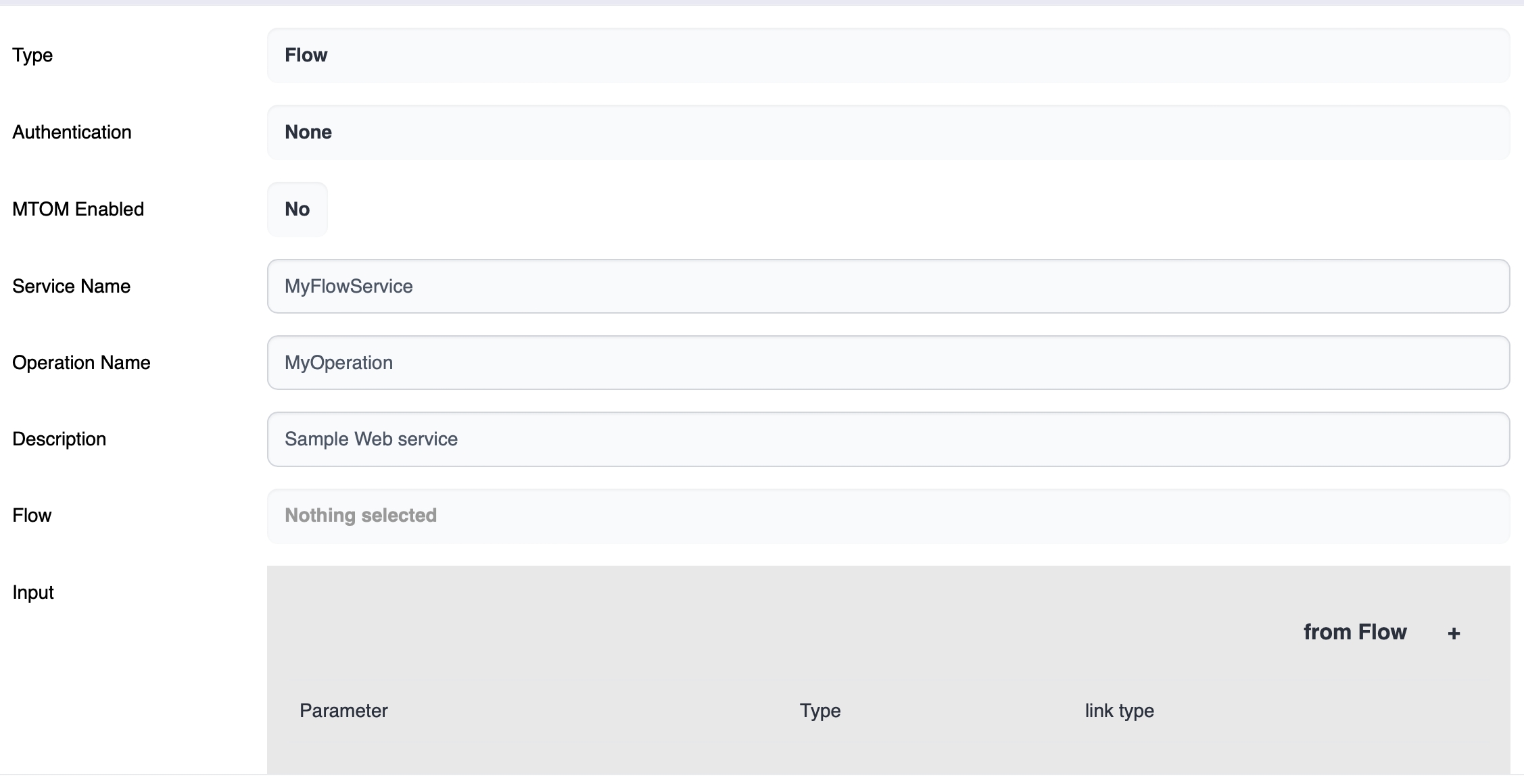 Input can be generated from the Input Parameters of the flow or manually. Click from Flow button, then the input parameters of the flow are set as input parameters of the web service.