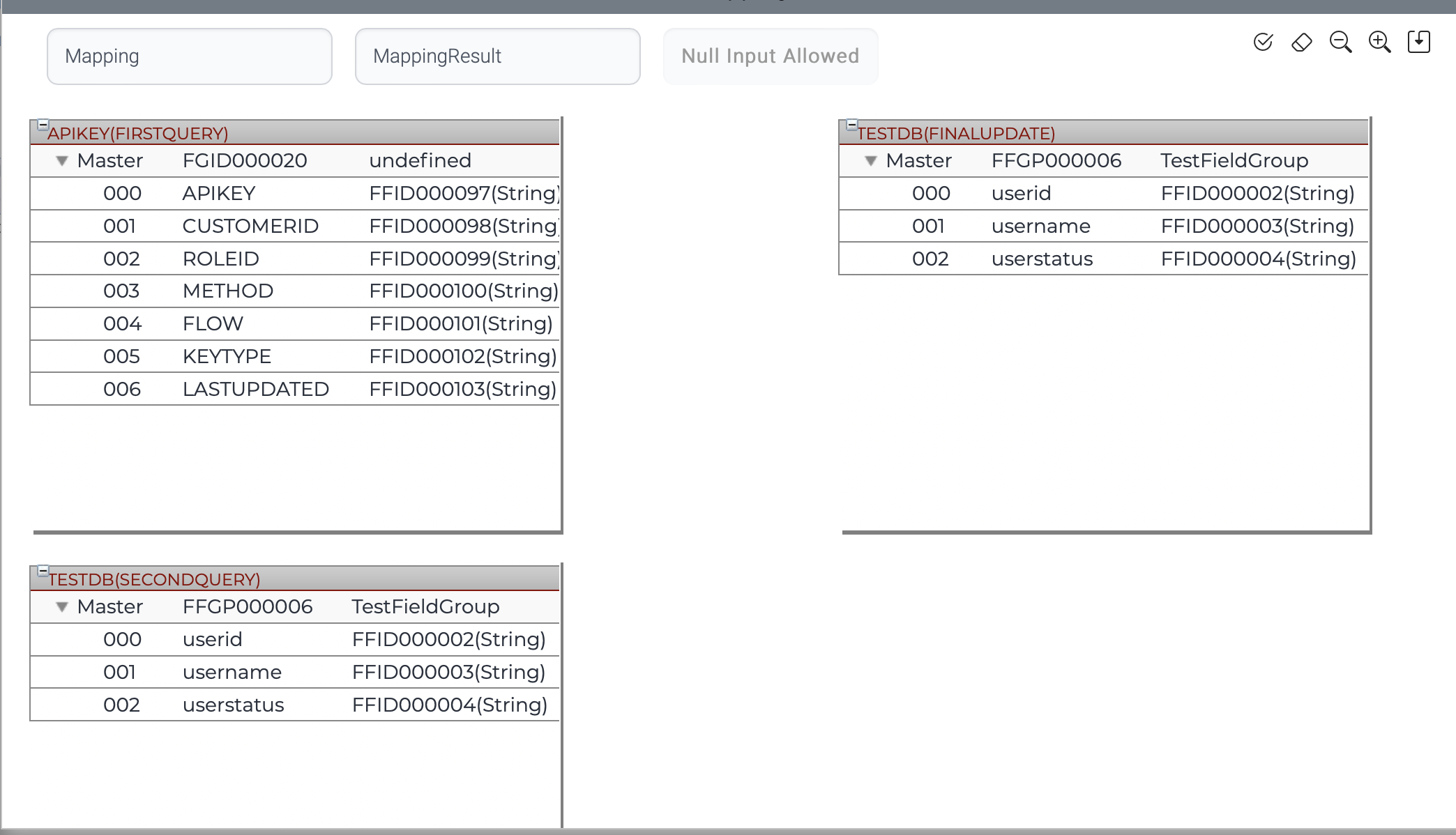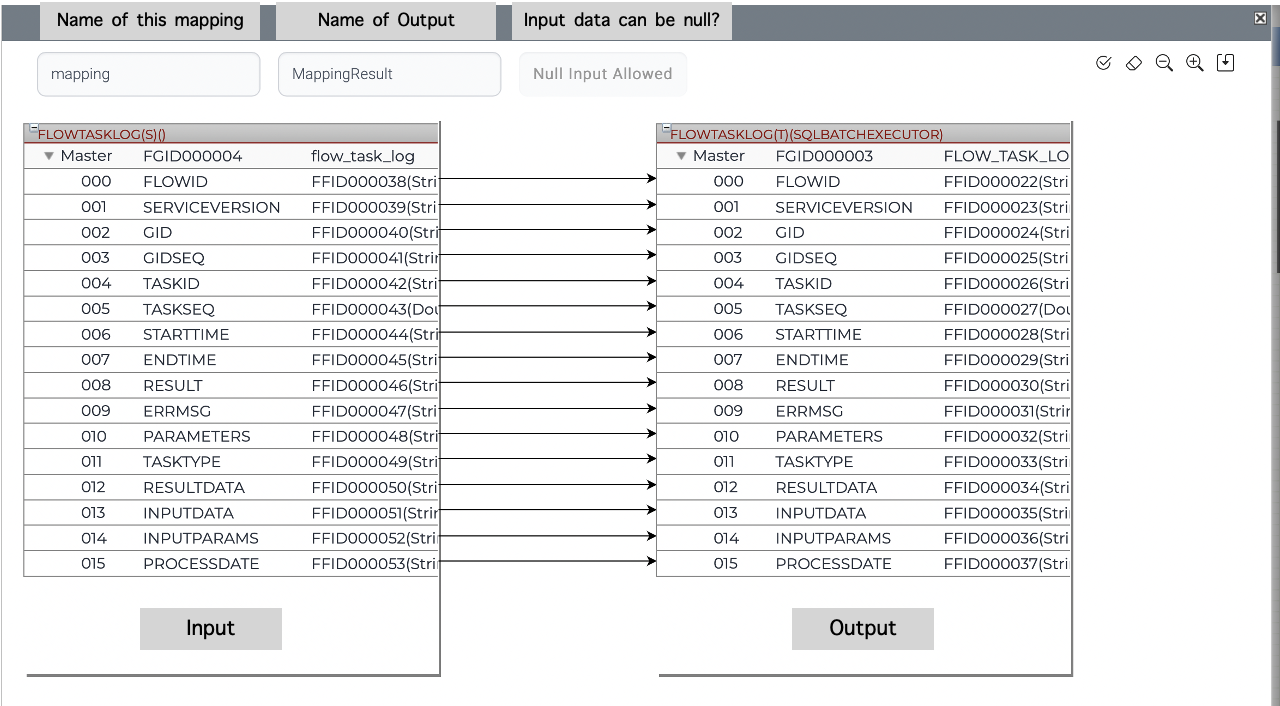 When Mapping component is open, two inputs are displayed. Each input and output table has this layout.