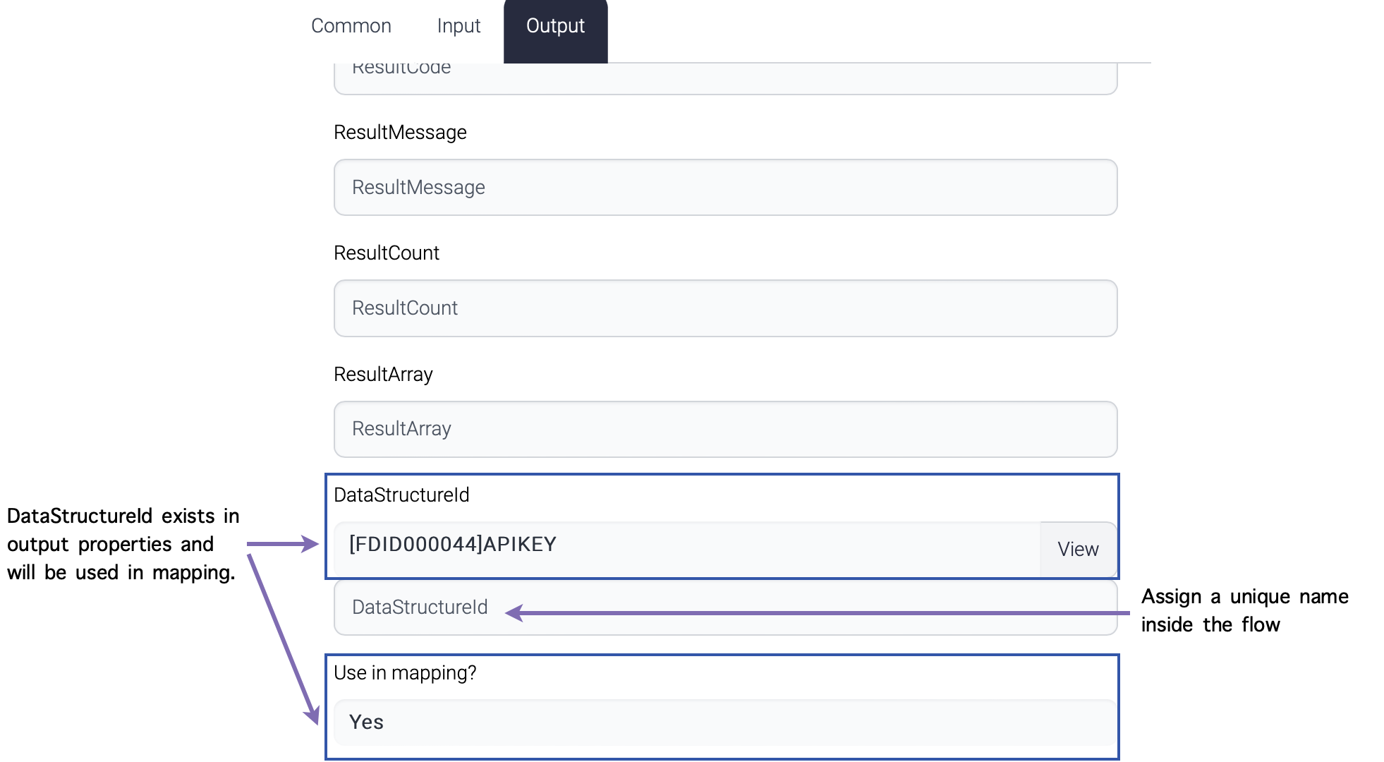 If the output includes the property DataStructureId, it is recommended to assign a unique name to the corresponding field (which is a text field). This can be done by modifying the output properties of the SQL Component, as shown in the screenshot.