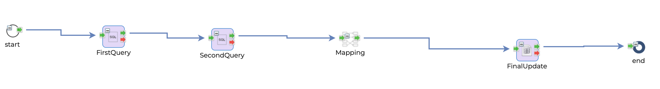 This flow has two SQL components, one SQLBatch component, and one Mapping component. Mapping component will find the input sources from the left two SQL components.