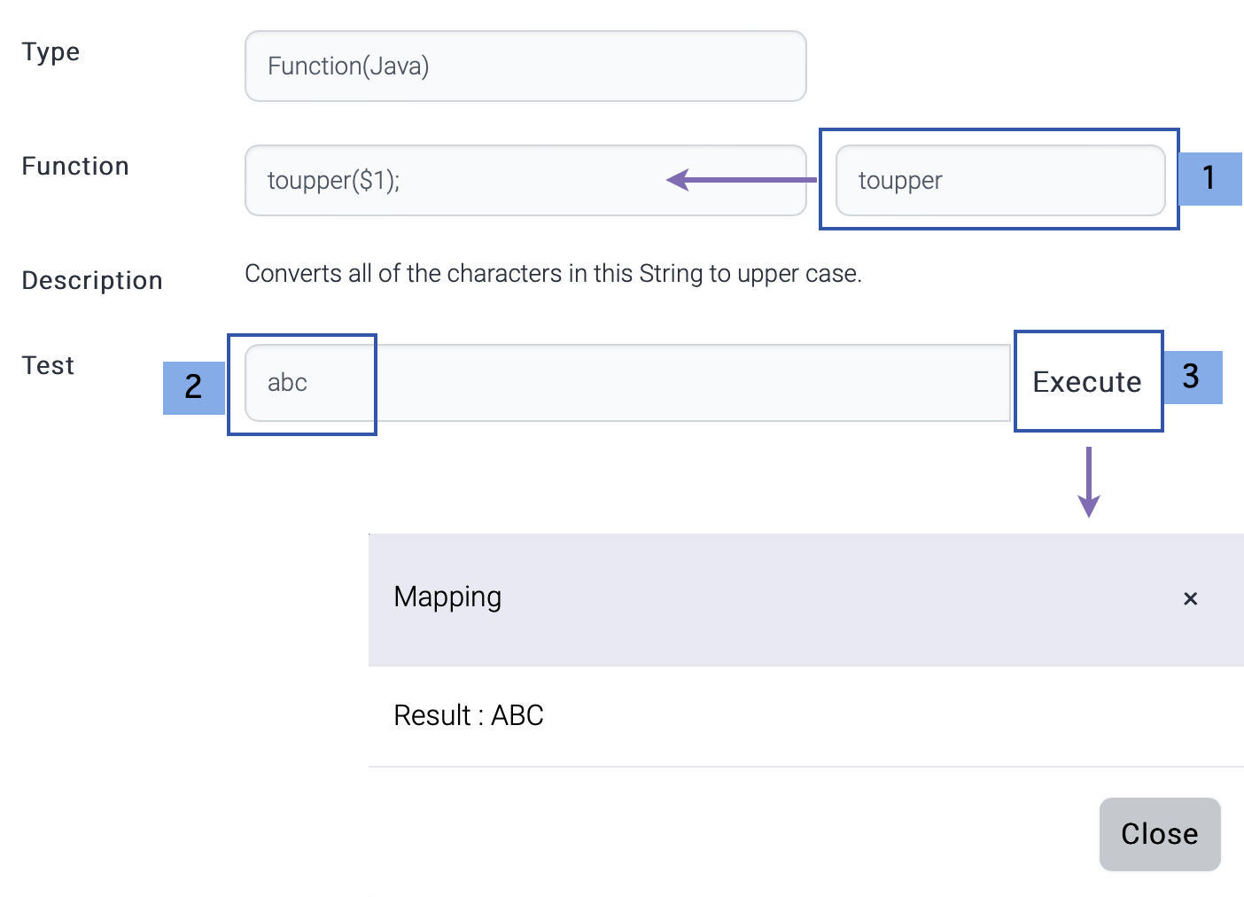 The parameters of Java function are defined with $1, $2 and ends with semi colon(;). The function can be tested at function dialog.
