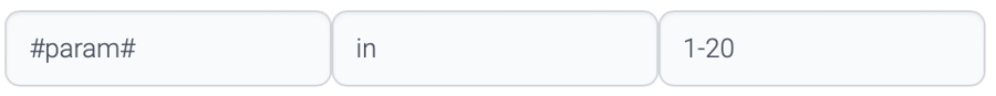 This operation evaluates with range of values. This operation uses start-end value format. For example, 1-9, A-F. This evaluation does not use JavaScript engine. There is no need of quotation for string type values.