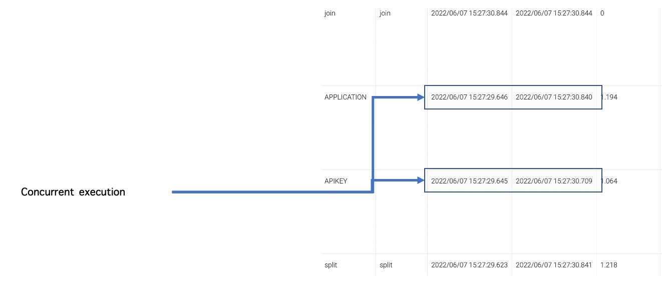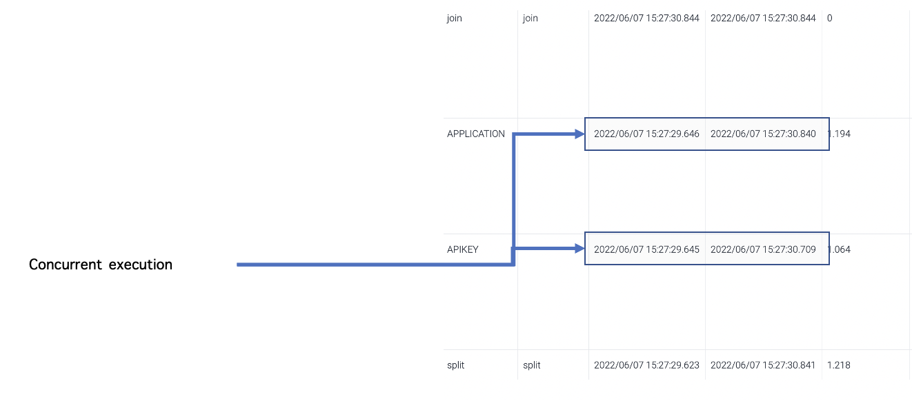 This flow is split into two SQL components and joined after those SQL components. Split creates two threads and assigns the SQL components to each thread respectively. Those two SQL queries are executed concurrently and Split waits until all the threads are complete. Once all the threads are complete, Split is complete..