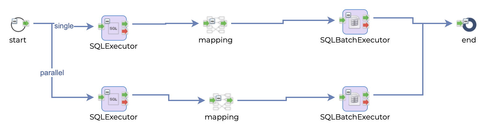 This flow has two routing paths(__RoutingPath). One is single and the other is parallel. These paths are about ParallelCount. SQLExecutor component retrieves data from the source table, mapping component generates input data for SQLBatchExecutor, and SQLBatchExecutor inserts the records to the target table.