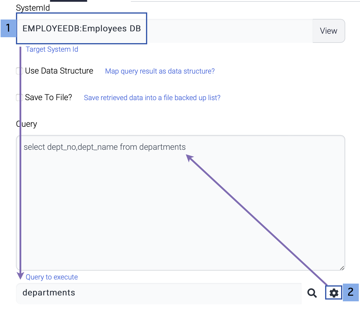 If Save To File is checked, and operation is select, then the result set is stored in a file. The list in the memory has the index information. It does not have the data. The real data is stored in a temporary file. This file is generated at the directory which java.io.tmpdir property points to with .fjs extension. The file is deleted after the list is garbage collected. If the expected record size of the input is huge, Save To File should be checked.