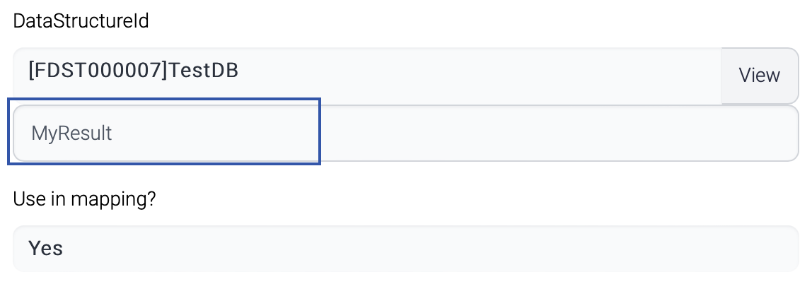 If UseDataStructure property is yes, the result set is carried in this parameter - MyResult. The default name of this parameter is DataStructureId and is duplicate with another parameter. The name should be changed if this result set is used in mapping.