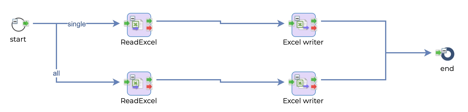 This flow has two paths. One is single and the other is all. Single path will load the data from one sheet and write that data to the output excel file. All path will load the data from all the sheets and write all the input data to the output excel file.