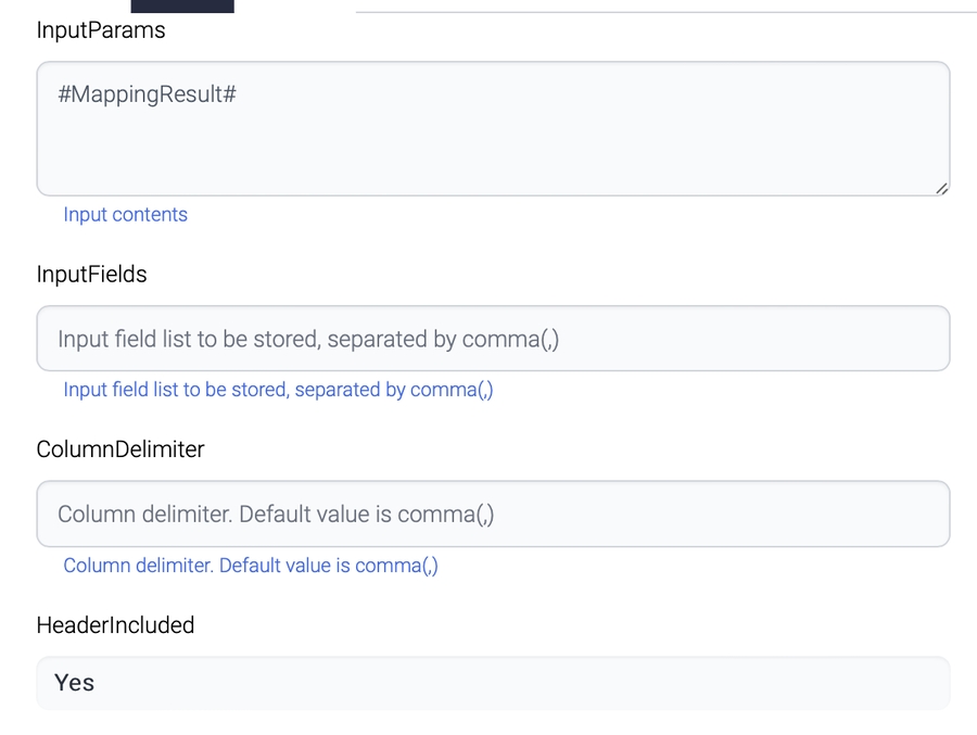 The FileOutput task uses the data from the MappingResult parameter to generate the output file this time. The output file configuration is the same as the previous example.