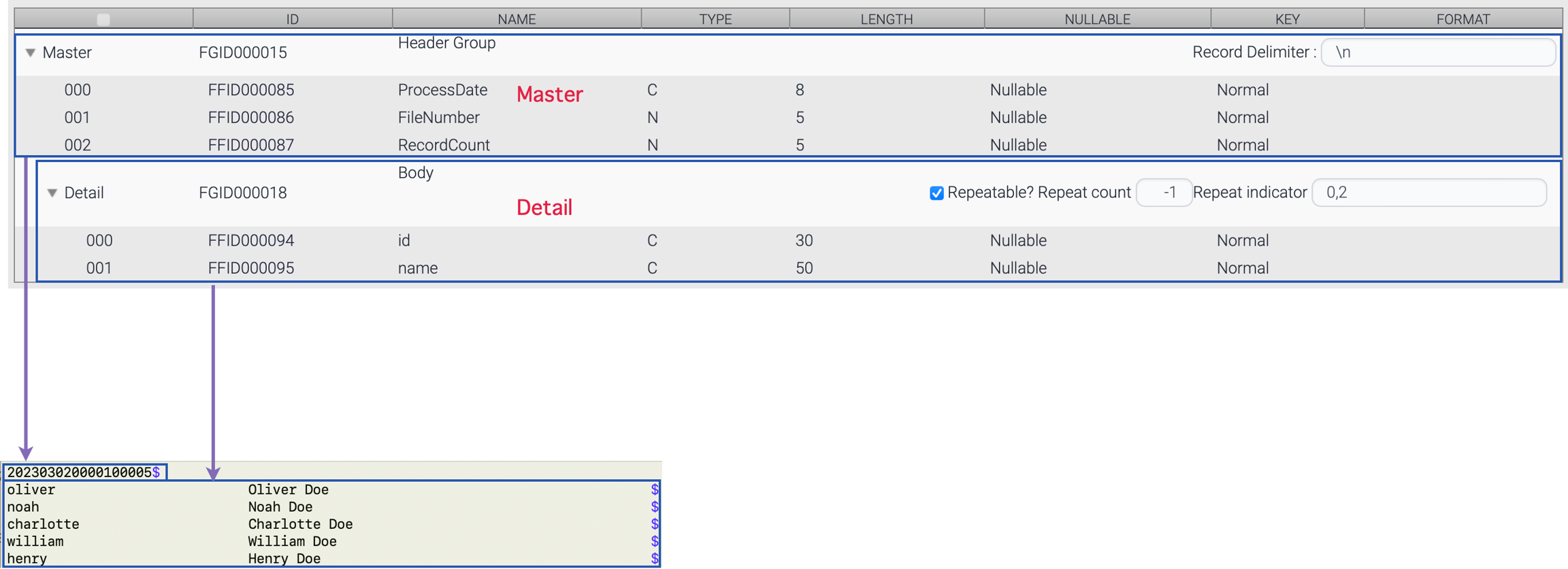 This data structure consists of one master group and one detail group. The detail group is repeatable, and the repeat count is set at the third field named RecordCount.