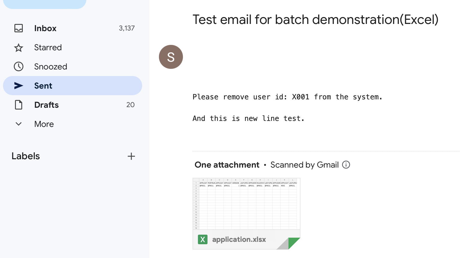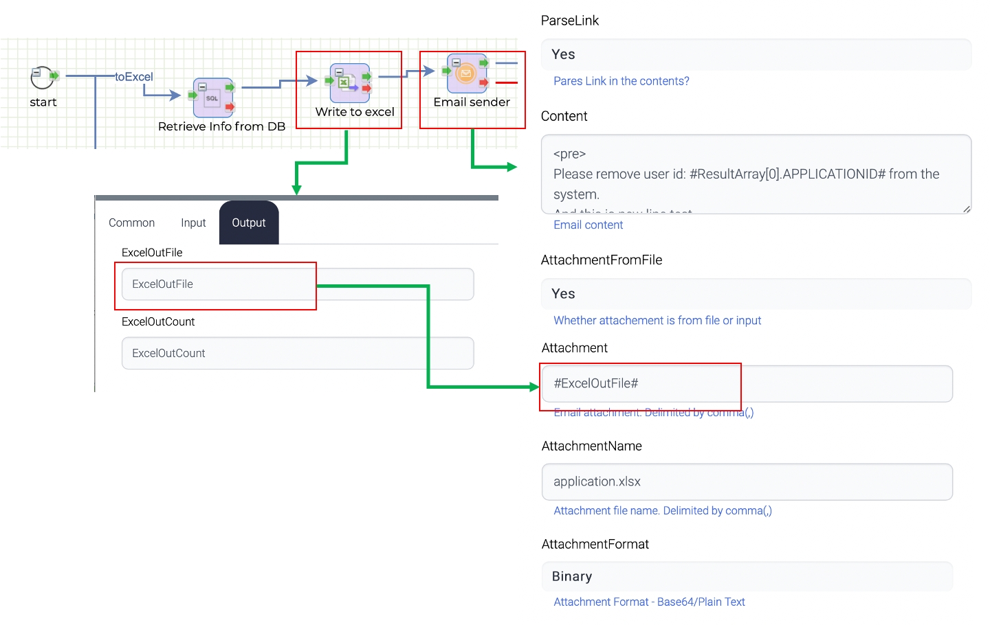 This example retrieves certain records from database, reads an excel file, and send an email with the retrieved data and the excel file as an attachment. The contents of the email contain a part of the retrieved records.