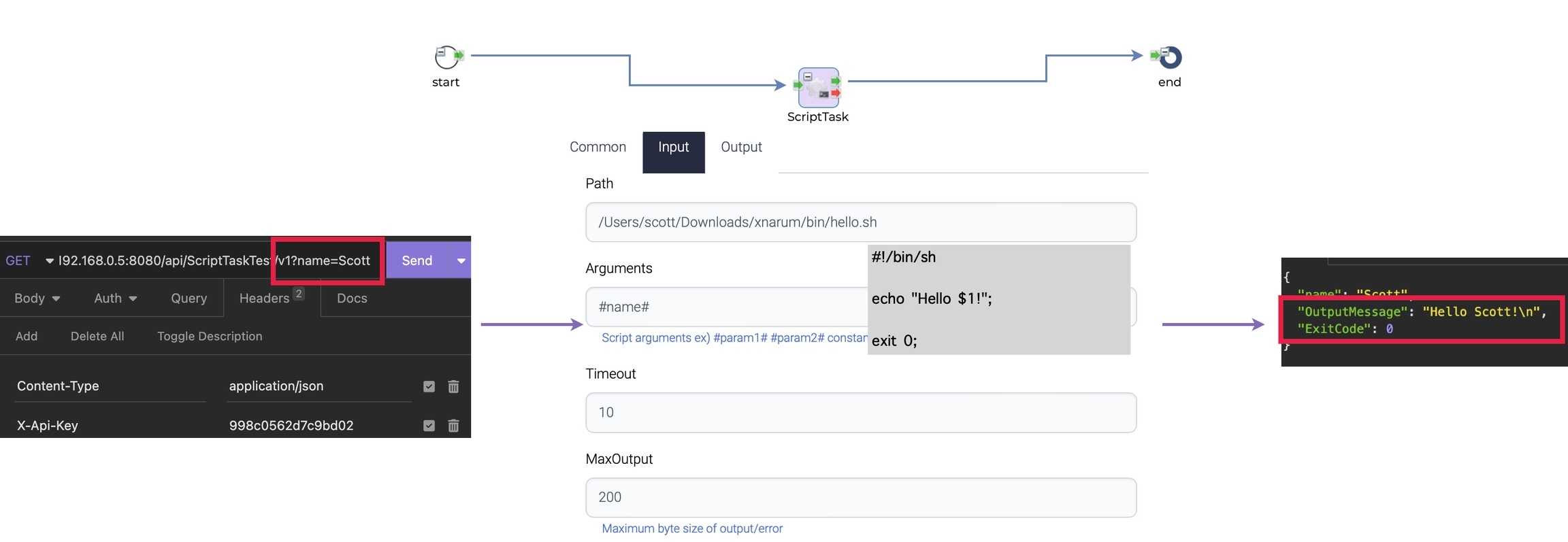 This example receives one parameter #name# and return "Hello #name!". The script returns 0 as exit code.